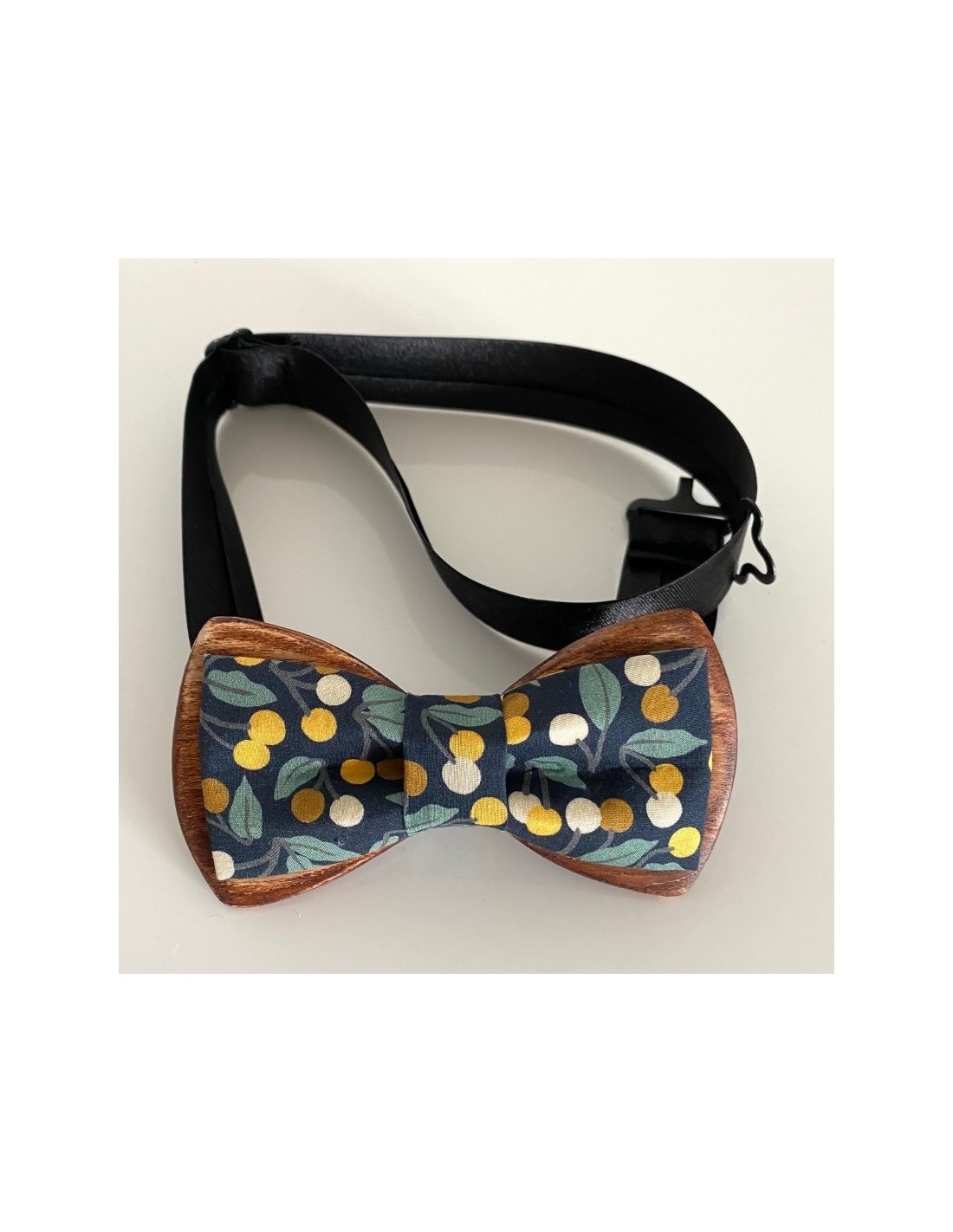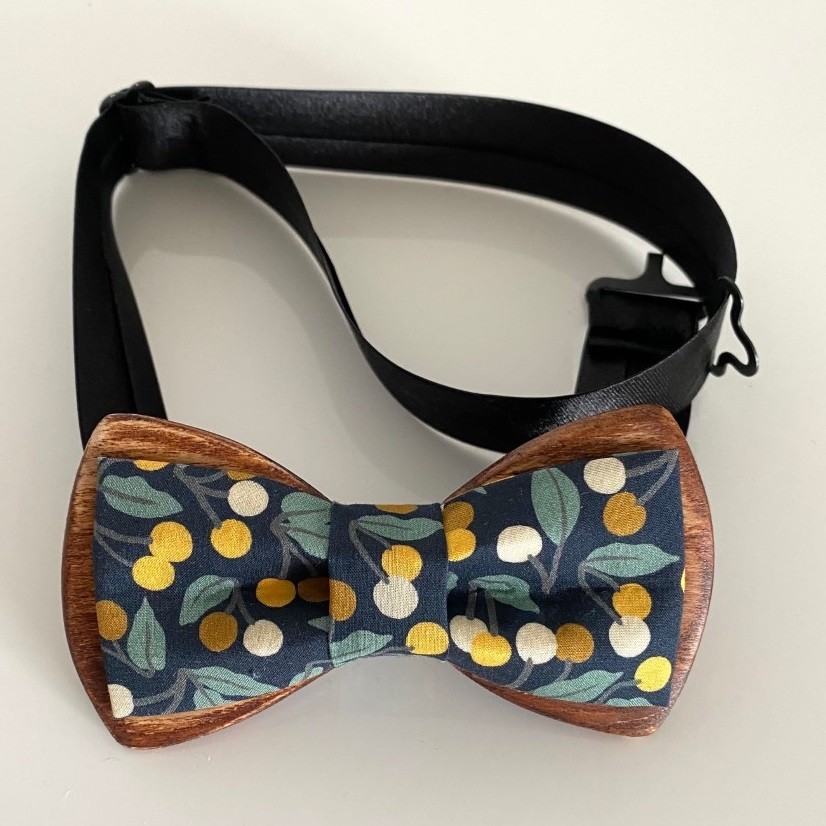 Nous vous présentons Charles, nœud papillon en bois avec des teintes orangées et verdâtres aux motifs en forme de cerise. Ce nœud papillon en bois apportera originalité et sobriété.