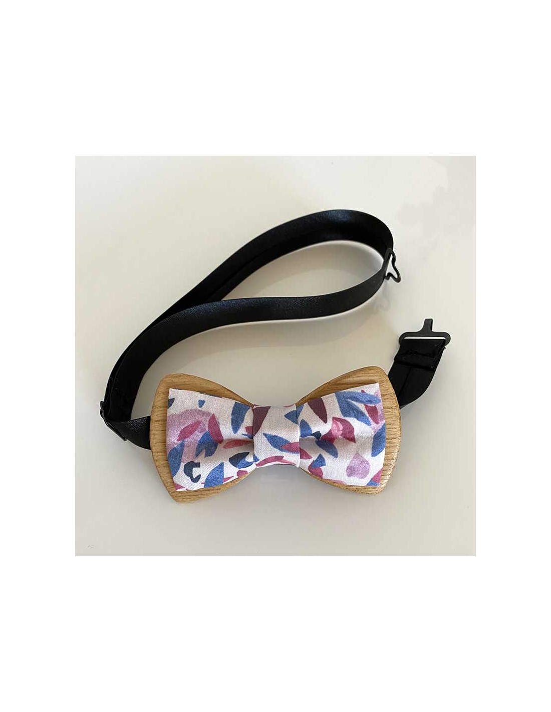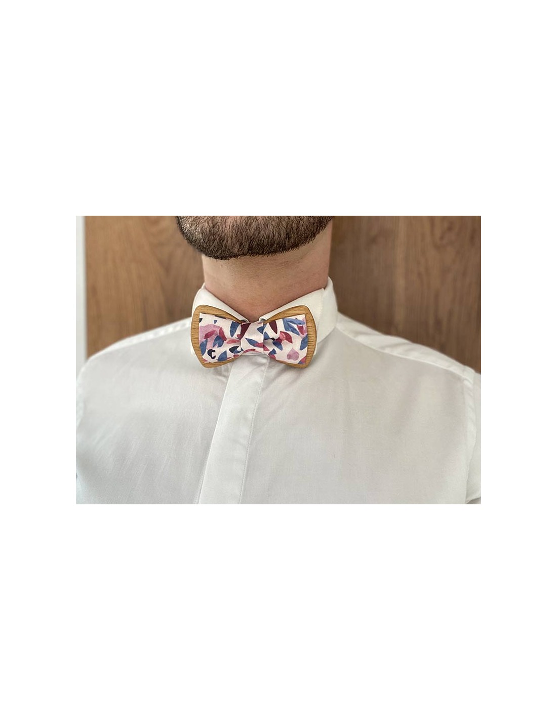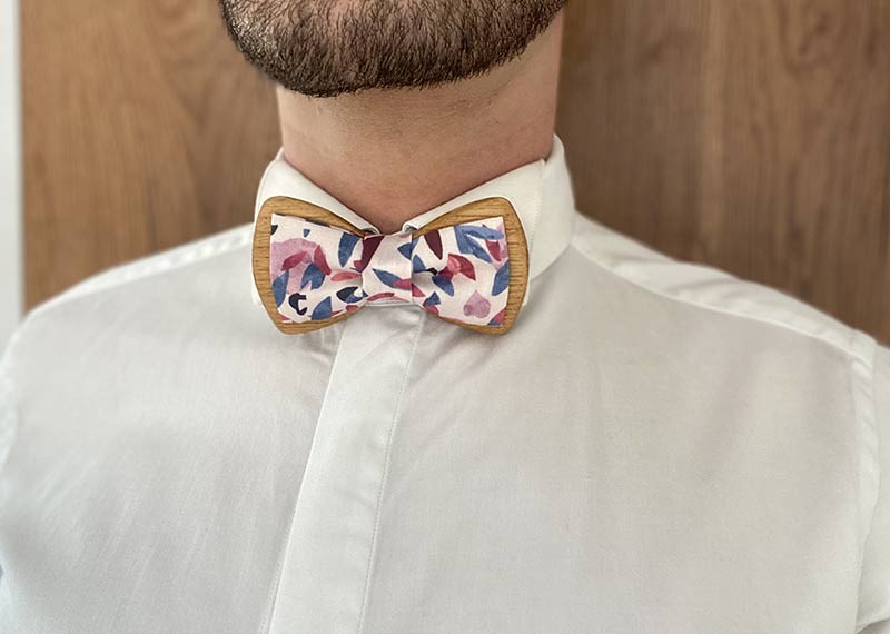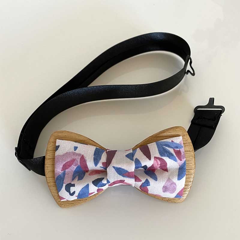 Nous vous présentons Ambroise, nœud papillon en bois associé à un tissu dont les motifs ressemblent à des feuilles. Avec des teintes de bleu et de rose, il apportera de la modernité à votre tenue.