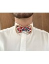Nous vous présentons Séverin, nœud papillon en bois avec un tissu aux nuances rouges et bleus, représentant des baies. Il apportera une petite touche d’extravagance à votre tenue.